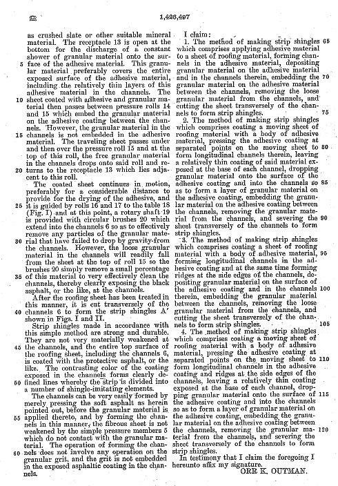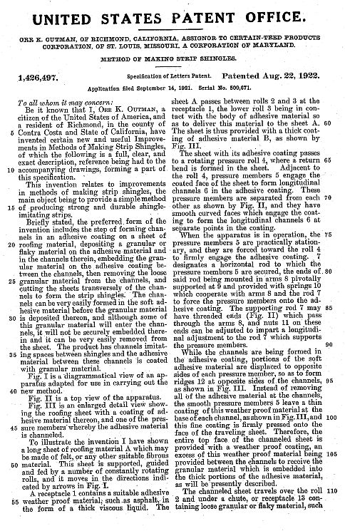 | Starting in the early 1900's, several of the Illinois Outman's, including William Henry Outman and his sons Orr, Winifred, and Leslie, worked for the Certain-Teed roofing company, both in Illinois and California. In September 1921 Orr K. Outman applied for a U. S. Patent for a method of making roofing shingles. This patent was issued in August 1922. (Winfred was later issued 2 of his own shingle-related patents.) Several years after this, Orr was sued in Patent Court by a Mr. William Hofman who claimed to have invented that type of shingle before Orr's patent. The case was found in favor of Orr Outman. Hofman then appealed the decision and lost again. Below is Orr's patent and the record of the Appeals Court decision: |