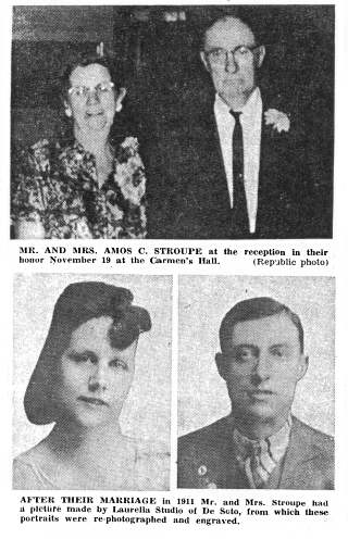 Twenty members of their immediate families were at the Stroupe home, 302 Fillmore for a buffet luncheon at noon. During the afternoon from two to five o'clock, scores of other relatives and friends attended the reception at the Carmen's Hall, bringing many beautiful anniversary gifts and best wishes to the well-known and respected De Soto couple. Ice cream and cake were served, with Duffner's providing these refreshments as has been their custom during this year, in observance of the De Soto Company's golden anniversary. Anniversary cakes for the pleasant occasion were also brought by the following: Mrs. Jessie Danz and Mrs. Ella Hercher, sisters of Mr. Stroupe; Mrs. John Haggerty, niece of Mrs. Stroupe, Mr. and Mrs. Woodrow Stroupe, their son and daughter-in-law, and Mrs. Carroll Stroupe and Mrs. Robert Patterson. Among the numerous messages of congratulation was a letter of congratulations from Congressman Richard H. Icoord: "You must have accumulated a store of treasured memories in the years you have spent together, and it is my sincere wish that you have abundant happiness and health in the future," wrote Mr. Ichord, who was joined by Mrs. Ichord in the expression of good wishes and kind regards. The Stroupes were married November 15, 1911, in a ceremony performed by the late Rev. D.W. Crow, a Methodist minister at the home of Mrs. Carrie Rudd on North fourth Street here. A dinner followed with members of the immediate families attending, at the home of Mr. Stroupe's parents, Mr. and Mrs. Charles Stroupe also of Fourth Street. Mrs. Stroupe is the former Miss Mabel Armstrong of Eureka, Kansas, who came to De Soto a few years before her marriage and made her home with her aunt. Mr. Stroupe was born in Festus, but has spent nearly all his life in De Soto. They have one son, Woodrow. He and his wife have two children, Shirley and Robert. They also reside at 302 Fillmore. As a young man Mr. Stroupe worked for the Iron Mountain and Missouri Pacific Railroad Companies as an oiler in the shops here. He closed long service in the machine shop of the Pittsburgh Plate Glass Company at Crystal City last year, retiring July 30, 1960. Both Mr. and Mrs. Stroupe are active and in good health. He is 69 and she is 68. They have made their home in De Soto continuously since their marriage, residing for many years on North Second Street and the past few years on Fillmore. They are members of St. Andrew's Methodist Church. Mr. Stroupe is a member of the Knights of Pythias Lodge at De Soto and Mrs. Stroupe is a social member of the Royal Neighbors. Mrs. Stroupe's principal interest has always been in her home and family. She enjoys having time for visiting with friends and watching favorite television programs. Mr. Stroupe who has always had a strong concern in union and political affairs, also maintains his interest in community matters and in sports and horse shows. The Press and The Republic of which they have been long-time readers, join their many friends in wishing the Stroupes many more happy years in the community where they have made their home. Guests at the reception included the following relatives: Mr. Stroupe's sisters, and brothers-in-law, Mr. and Mrs. Edgar Danz, St. Louis and Mr. and Mrs. Charles Hercher, De Soto; and Mrs. Stroupe's sister, Mrs. Bonnie Mullins, St. Louis. Mr. and Mrs. James Dyle, De Soto, Mr. Stroupe's niece and husband. Mr. and Mrs. John Haggerty and Richard and Mr. and Mrs. Ronald Wilson of St. Louis, Mrs. Stroupe's niece and family and Mr. and Mrs. Harve Stroupe, Mapaville, uncle and aunt of Mr. Stroupe. Also attending were Mr. and Mrs. E. E. How, Hematite; Mrs. Joe Cross and David Harmon, Crystal City; Mrs. Dorothy Hill and Carolyn and Tommy, Mr. and Mrs. Howard Norris, Mrs. Minnie Norris and Mr. and Mrs. Leonard Outman, Lemay. Mr. and Mrs. Clyde Outman, Affton; Mr. and Mrs. James Helton, Mrs. Lela Helton, Mr. and Mrs. W. B. Duker, Mr. and Mrs. James Stroupe, Mr. and Mrs. P. W. Seitz, Fred Seitz, Gary Malone, Bobby Malone and Warren Norris, St. Louis, Mr. and Mrs. Joe M. Regan, Festus; Mr. and Mrs. Claude Sherman, Crystal City. Mr. and Mrs. Walter Buerger and daughter, Hillsboro; Mr. and Mrs. W. W. Purcey, Walter J. Purcey, Jimmie Robison and Mr. and Mrs. W. E. Outman, Bonne Terre; Mr. and Mrs. Phil Stroupe and Mr. and Mrs. Cecil Ballard, Victoria. Mr. and Mrs. Charlie Norris and daughters; Mrs. Cora Wilson and Donna Wilson, Cotter Creek. Woodrow, Alberta, Shirley and Bob Stroupe, Donna Bradford, Charlie Wall, Mr. and Mrs. Carroll Stroupe, Mr. and Mrs. Robert Patterson, Mr. and Mrs. Carl Patterson and Miss Bessie Stroupe. Many other local friends called during the reception. |