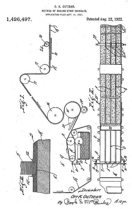 | Starting in the early 1900's, several of the Illinois Outman's, including William Henry Outman and his sons Orr, Winifred, and Leslie, worked for the Certain-Teed roofing company, both in Illinois and California. In September 1921 Orr K. Outman applied for a U. S. Patent for a method of making roofing shingles. This patent was issued in August 1922. (Winfred was later issued 2 of his own shingle-related patents.) Several years after this, Orr was sued in Patent Court by a Mr. William Hofman who claimed to have invented that type of shingle before Orr's patent. The case was found in favor of Orr Outman. Hofman then appealed the decision and lost again. Below is Orr's patent and the record of the Appeals Court decision: |